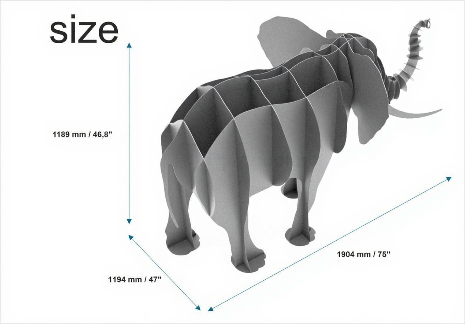 Our metal elephant artwork measures at (1189mm x 1194mm x 1904mm).